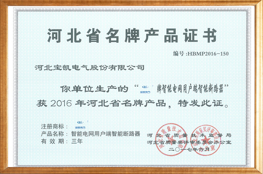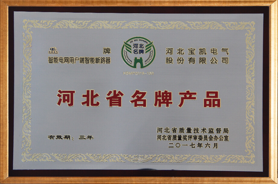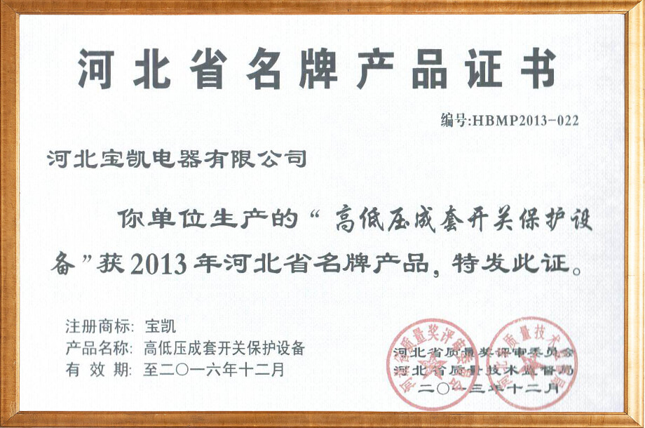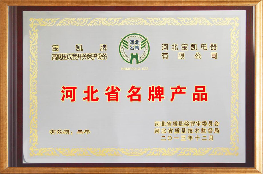 河北省名牌產(chǎn)品證書