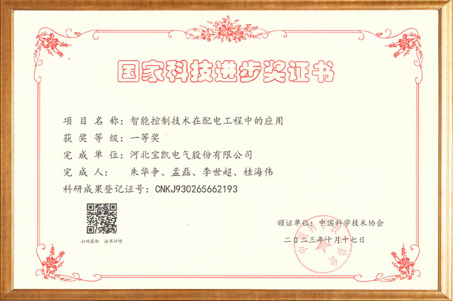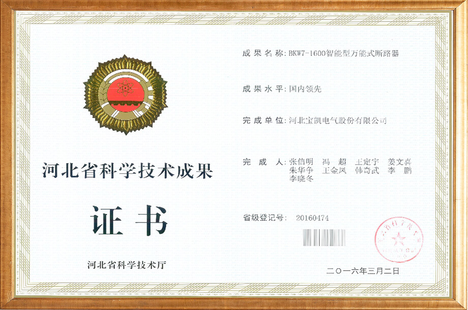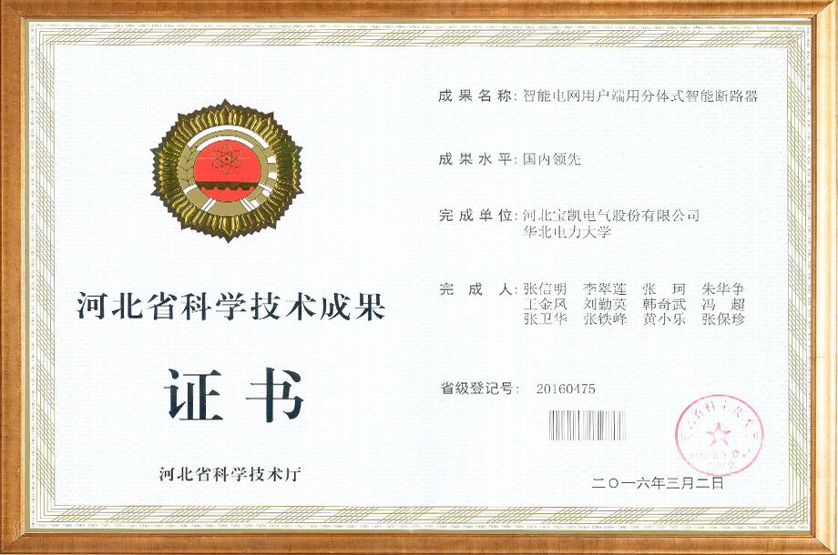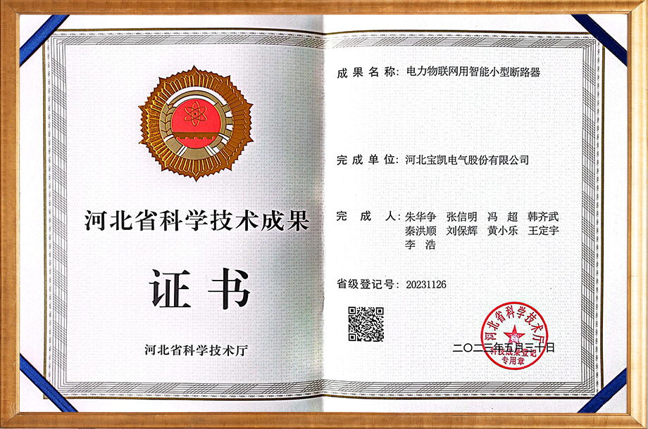 電力物聯(lián)網(wǎng)用智能小型斷路器-科技成果證書