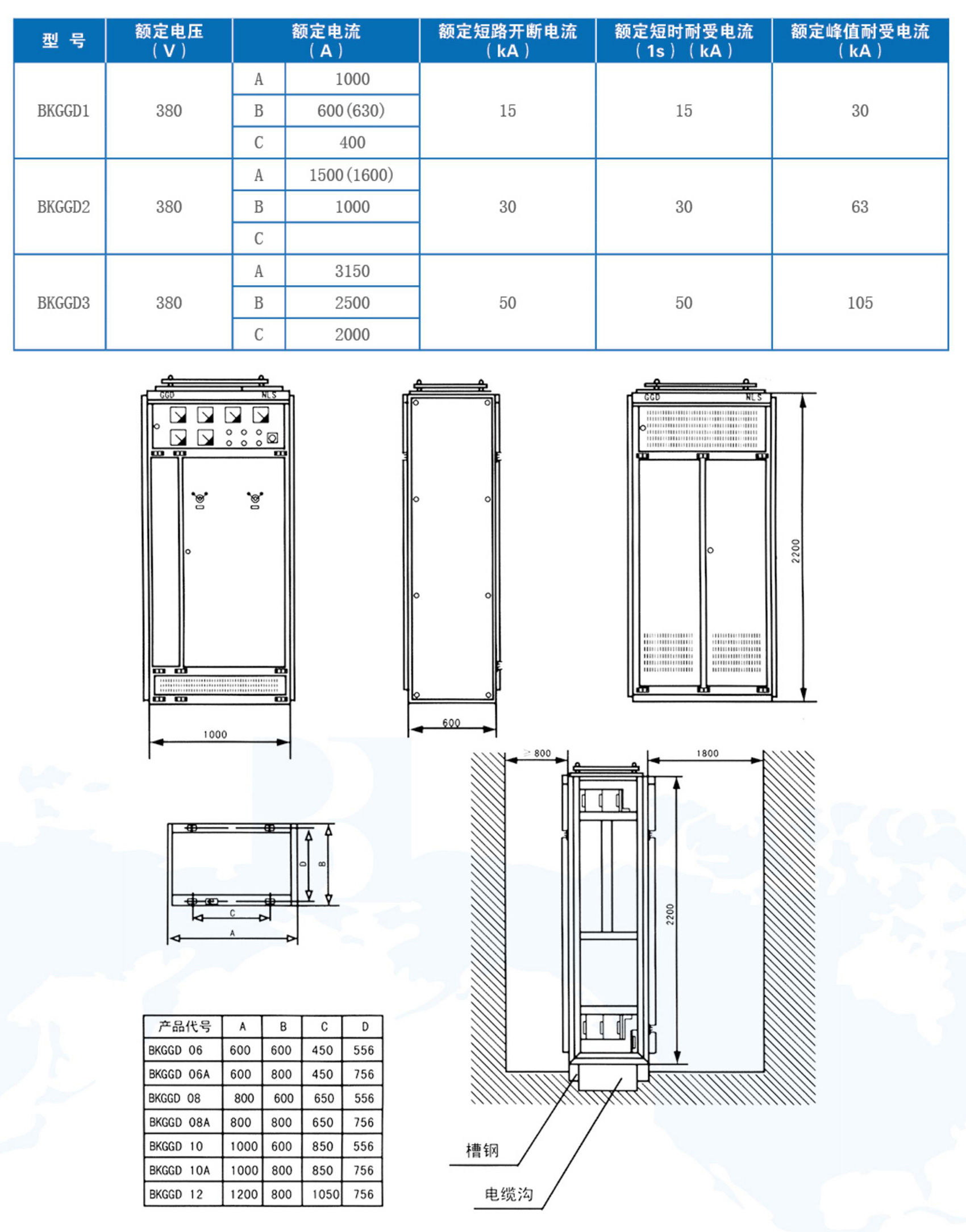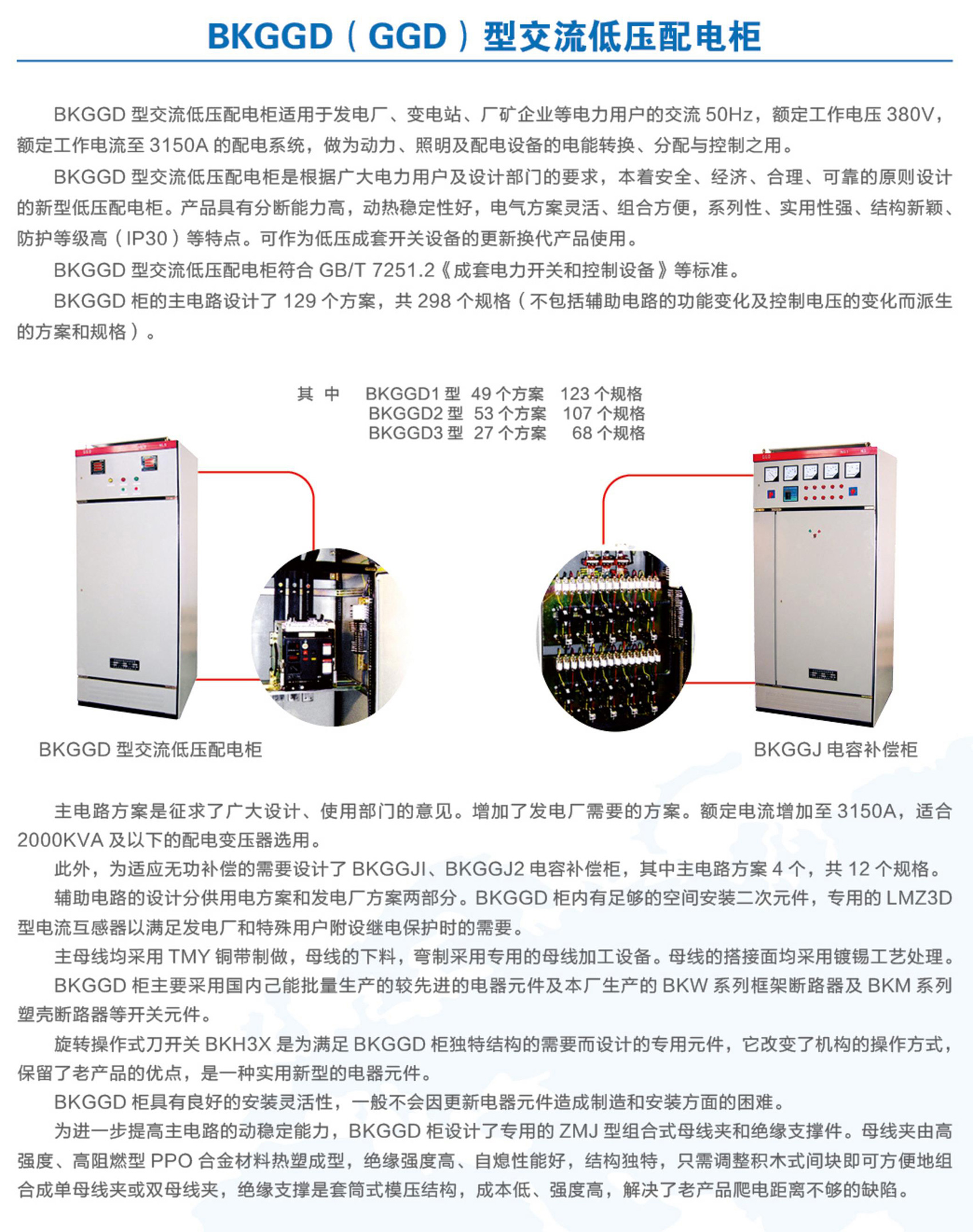 BKGGD型交流低壓配電柜適用于發電廠、變電站、廠礦企業等電力用戶的交流50Hz,額定工作電壓380V,額定工作電流至3150A的配電系統,做為動力、照明及配電設備的電能轉換、分配與控制之用。BKGGD型交流低壓配電柜是根據廣大電力用戶及設計部門的要求,本著安全、經濟、合理、可靠的原則設計的新型低壓配電柜。產品具有分斷能力高,動熱穩定性好,電氣方案靈活、組合方便,系列性、實用性強、結構新穎、防護等級高等特點。可作為低壓成套開關設備的更新換代產品使用。