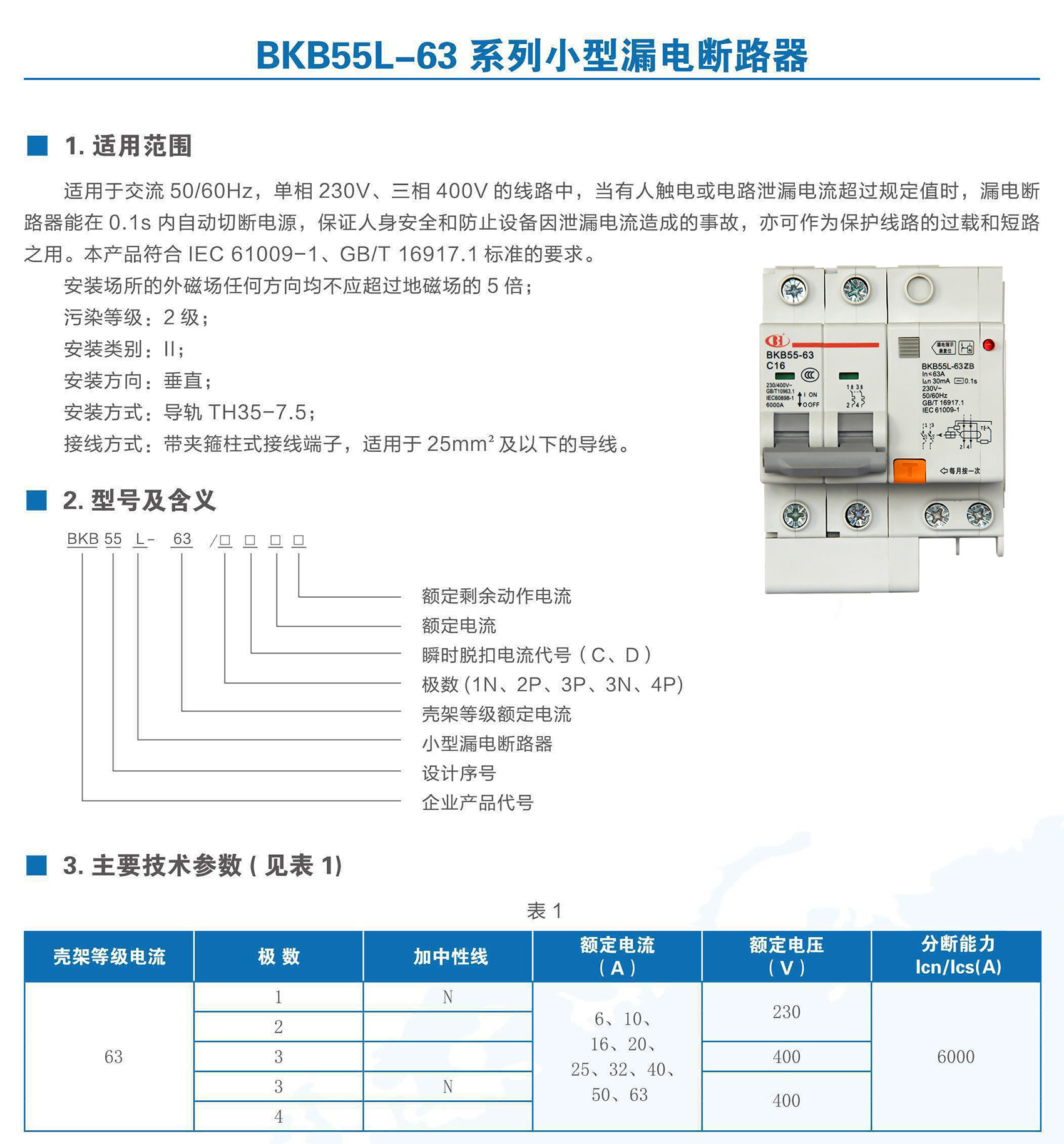 BKB55L-63ZB系列自診斷小型漏電斷路器適用于交流50/60Hz,額定電壓至230V,額定電流至63A的線路中,作為人身觸電和設(shè)備漏電保護(hù)之用;剩余電流動(dòng)作功能自診斷、失效報(bào)警,當(dāng)產(chǎn)品漏電保護(hù)功能出現(xiàn)異常時(shí)會(huì)通過(guò)報(bào)警模塊提醒用戶;并可用于線路和電氣設(shè)備的過(guò)載及短路保護(hù)。本產(chǎn)品符合GB/T 16917.1、IEC 61009-1標(biāo)準(zhǔn)。